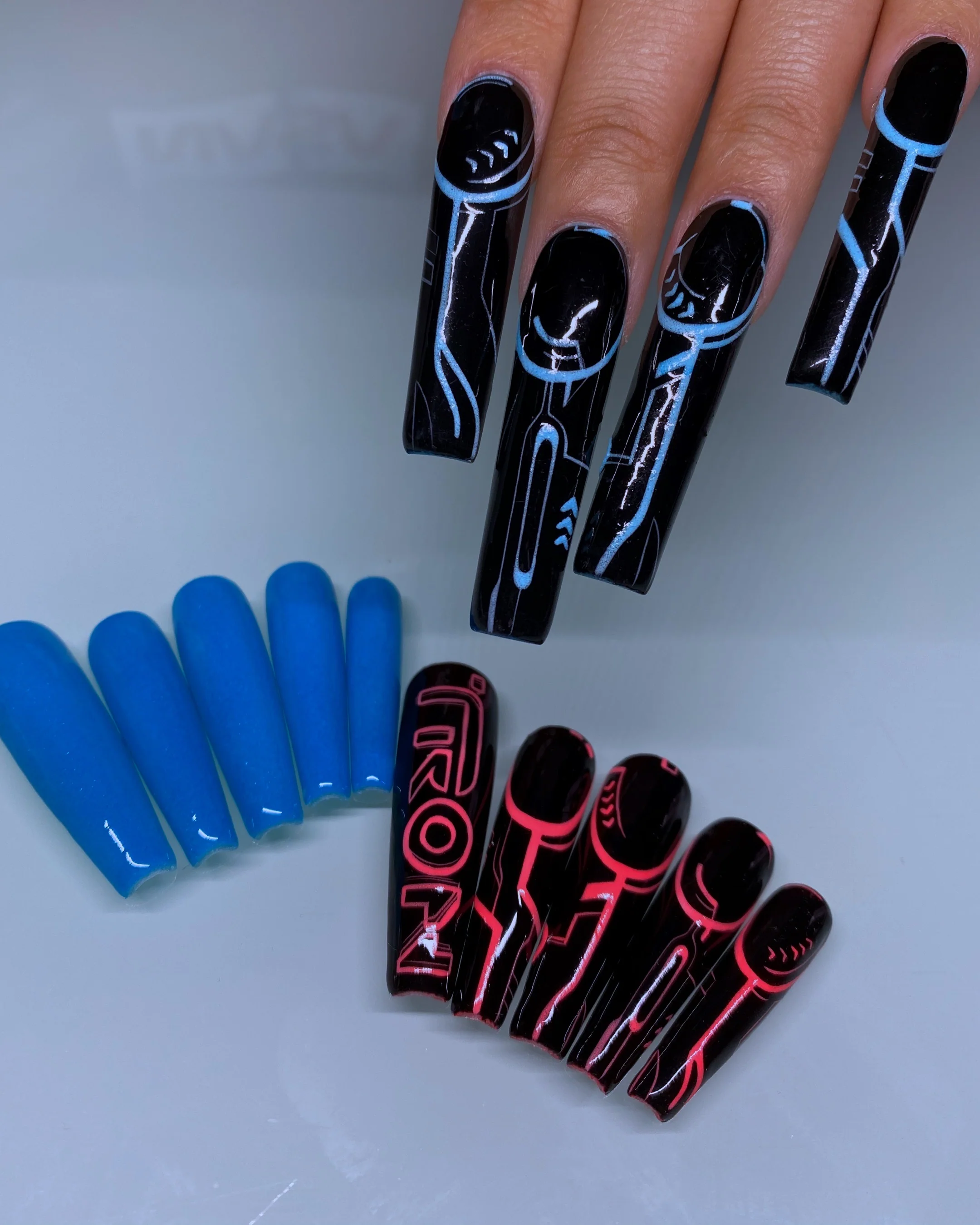Virtually perfect. Live in a cyberworld fantasy in our Cyberfrench set, inspired by the movie Tron: Legacy. Glowing hand-painted Cyberfrench, these nails are available in customizable colors including yellow, pink, white, and blue. Don't forget to activate them under UV light to make them glow-in-the-dark.